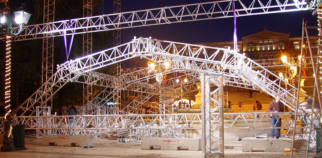 2002 was the actual start of what resulted in the roofed staging systems. In association with the Greek distributor, a New Year's project was developed in the Syntagma square (Athens central square). The result was an impressive, transparent and curved trussing roof structure with eye-shaped front and rear projection screens. Nothing but standard ALC Truss items of course!